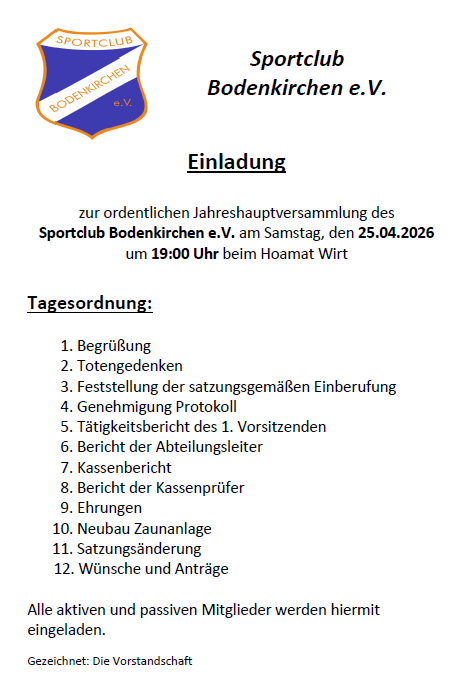 Ferwagner berichtete über die bereits bekannten Termine und Veranstaltungen im neuen Vereinsjahr: 10.04.26 Frühjahrsversammlung vom Kreis 106, Eigenes Hallenturnier am 16.04. und am 17.04.26 Das Großgemeindeturnier ist für den 18.07.26 anberaumt. Am 24.07. ist ein Vergleichstunier gegen Aich und Vilslern vorgesehen. Das alljährliche Freundschaftsschießen Alt gegen Jung findet am 10.10.26 statt. Die Vereinsmeisterschaft mit Saisonabschlußfeier ist für den 07.11.26 eingeplant. An folgendeen Tagen ist die Stockhalle vermietet: Am 02.05.26 an den Kreis 106 zum Kreiszielwettbewerb. Das größte Ereignis in der Vereinsgeschichte findet am 12.07.26 in der Bodenkirchner Stockschützenhalle , nämlich die Bayerische Meisterschaft im Zielschießen statt. Der Oberliga-Spieltag der Freunde Geisenhausen 1 und Aham 2 wird am 18.07.26 in der Halle ausgetragen. Am 11.09.26 und 12.09.26 trägt der Kreis 106 die Aufstiegs-und Abstiegsrunden aus.